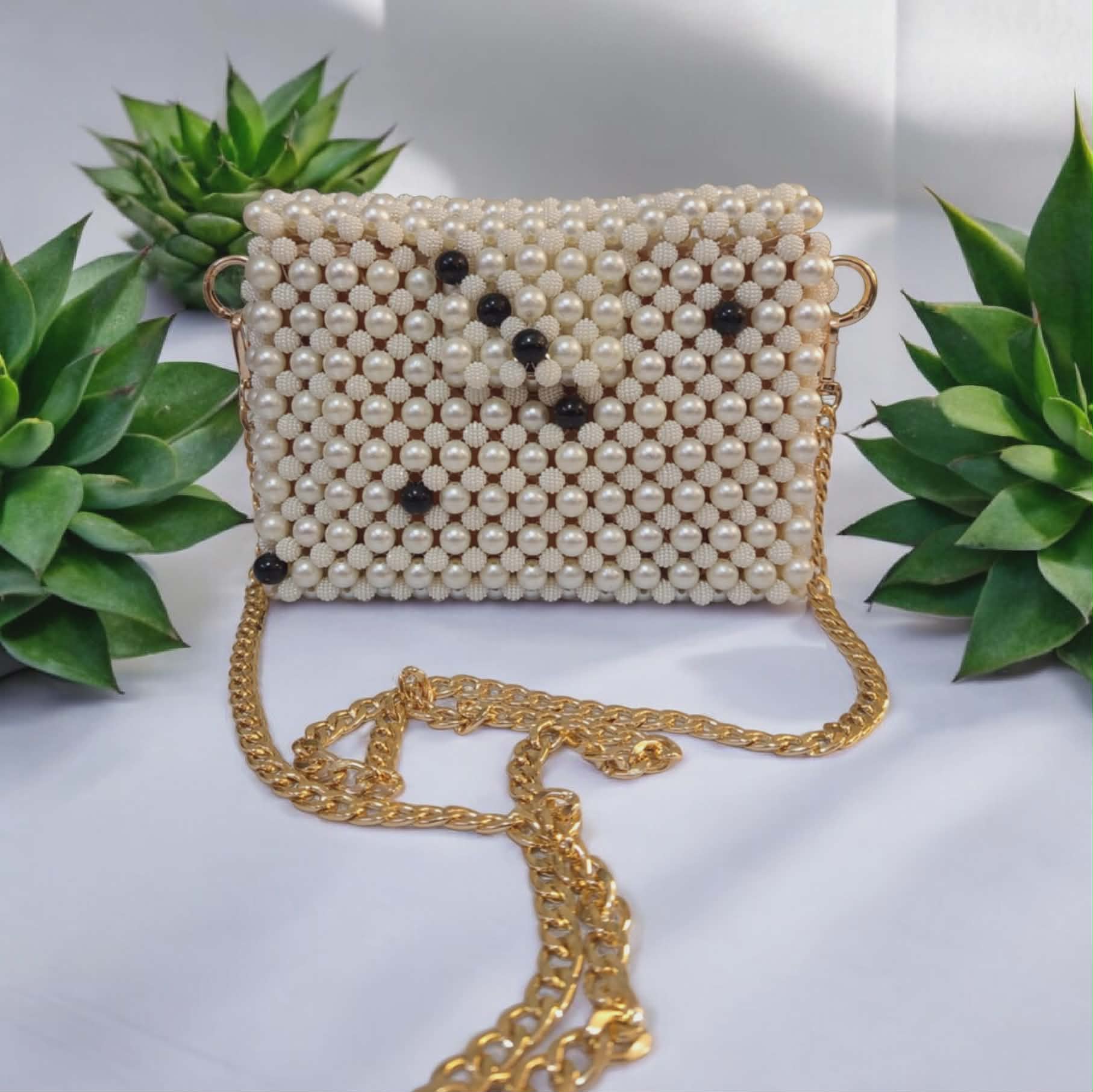 - Diseño elegante con perlas blancas y detalles en negro.